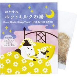 「おやすみ前にそっとページをめくりたくなる、絵本のようなバスバッグ」バスソルトに天然ドライハーブ「カミツレ」、天然由来成分「スキムミルク」を配合。ミルキーホワイトの湯色。